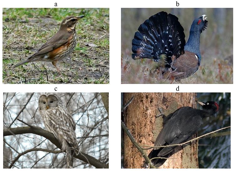 Рис. 14. Редкие и охраняемые виды орнитофауны ЭГС массивов лёссовых грунтов: a – белобровик (Turdus iliacus); b – глухарь (Tetrao urogallus); c – длиннохвостая неясыть (Strix uralensis); d – чёрный дятел (Dryocopus martius) [26]