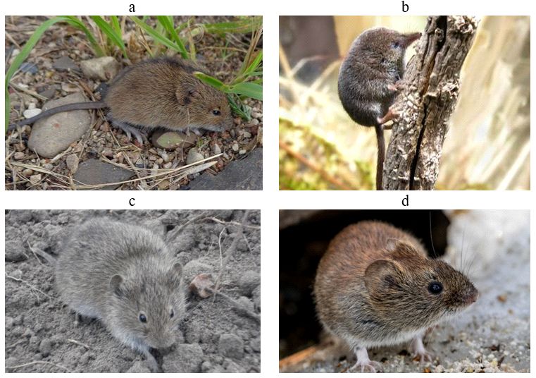 Рис. 15. Норные млекопитающие ЭГС массивов лёссовых и лёссовидных грунтов: a – мышовка лесная (Sicista betulina); b – бурозубка малая (Sorex minutus); c – полевка обыкновенная (Microtus arvalis); d – полевка лесная (Clethrionomys glareolus) [26]