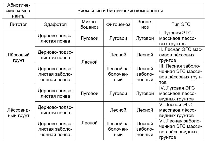 Основными принципами ее построения выступают особенности массивов лёссовых грунтов – литотопов, которые подразделяются на лёссовые и лёссовидные грунты. Далее, учитывая два типа почв, развитых на анализруемых массивах, выделяются два соответствующих эдафотопа. Затем подразделение ведется с учетом особенностей биотических компонентов: микробо-, фито- и зооценоза, в которых выделяется два основных типа: луговые и лесные. Для последних также характерны лесные заболоченные типы, связанные с наличием дерново-подзолистых заболоченных почв.