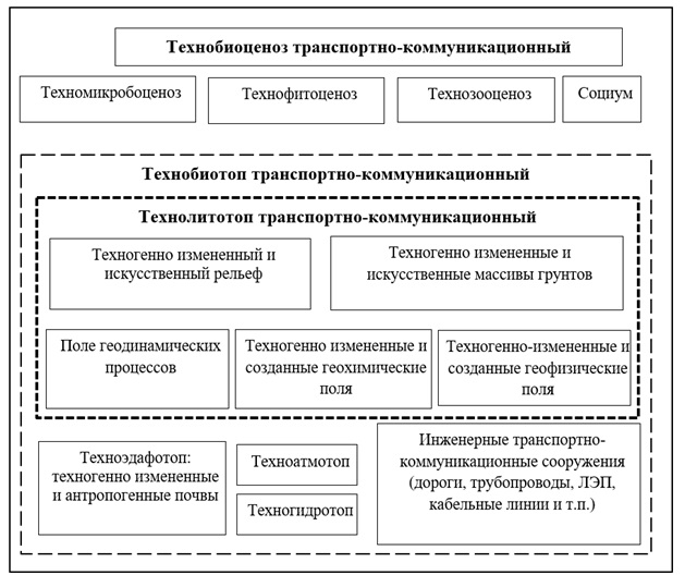 Эколого-геологические системы (ЭГС) транспортно-коммуникационных комплексов, как показано на рисунке 1, имеют схожую с другими техногенными ЭГС структуру. Они включают в себя как абиотические (литотоп, гидротоп, атмотоп, технические сооружения) и биокосные (эдафотоп), так и биотические (микробоценоз, фитоценоз, зооценоз) компоненты, но техногенно измененные или антропогенные за счет социума и создаваемых им технических транспортно-коммуникационных сооружений.