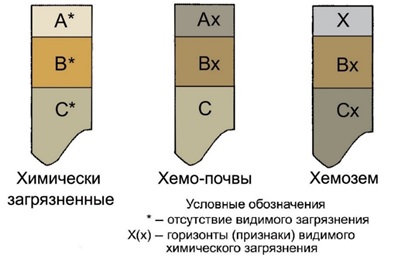 Химически преобразованные почвы выявляются по морфологическим изменениям, вызванным воздействием различных химических веществ, что ведет к вредному химическому загрязнению и стратификации техногенного субстрата (например, почвы на участках разлива нефти и нефтепродуктов при авариях подвижного состава – нефтеземы). При этом существенно преобразуются генетические горизонты, могут появляться новые горизонты, не свойственные данному типу почвообразования (рис. 8). Вновь сформированный профиль может быть отчасти подобен естественному профилю, но чаще всего представляет собой почвенно-техногенное образование, не имеющее полных природных аналогов. Трансформация профиля сопровождается существенным изменением характера миграции веществ, гумусообразования и других почвенных процессов.