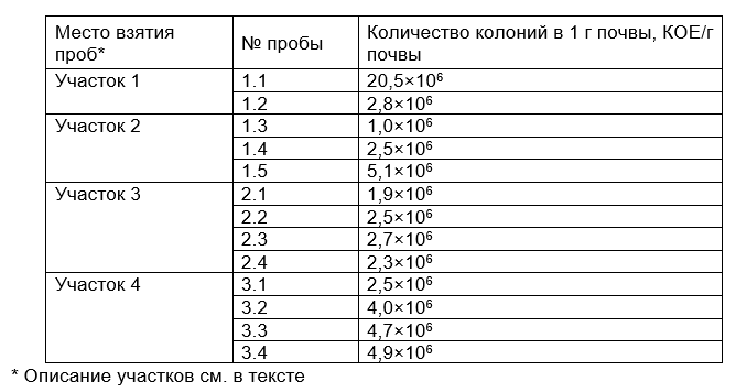 Во всех исследованных образцах почвы, независимо от места взятия, были обнаружены сапрофитные микроорганизмы в форме палочек и кокков. Общее количество микроорганизмов в каждой пробе указано в таблице.