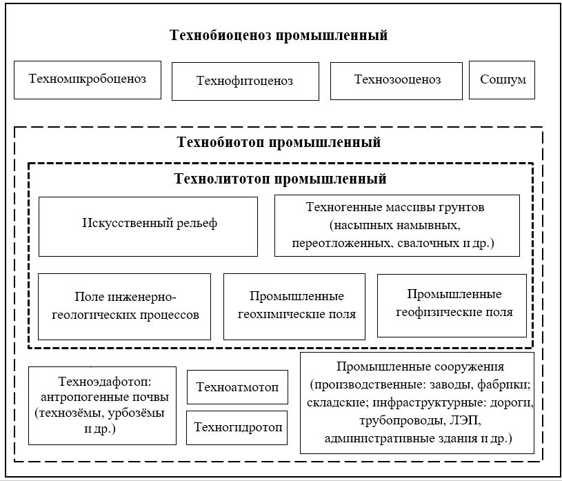 Общая структура промышленных эколого-геологических систем показана на рисунке 1. Для них характерны те же основные структурные компоненты (подсистемы), что и для иных техногенных ЭГС, – как абиотические (литотоп, гидротоп, атмотоп, технические сооружения), так и биотические (эдафотоп, микробоценоз, фитоценоз, зооценоз). Но эти компоненты являются техногенно измененными, или искусственными (антропогенными), из-за влияния социума и создаваемых им технических сооружений.