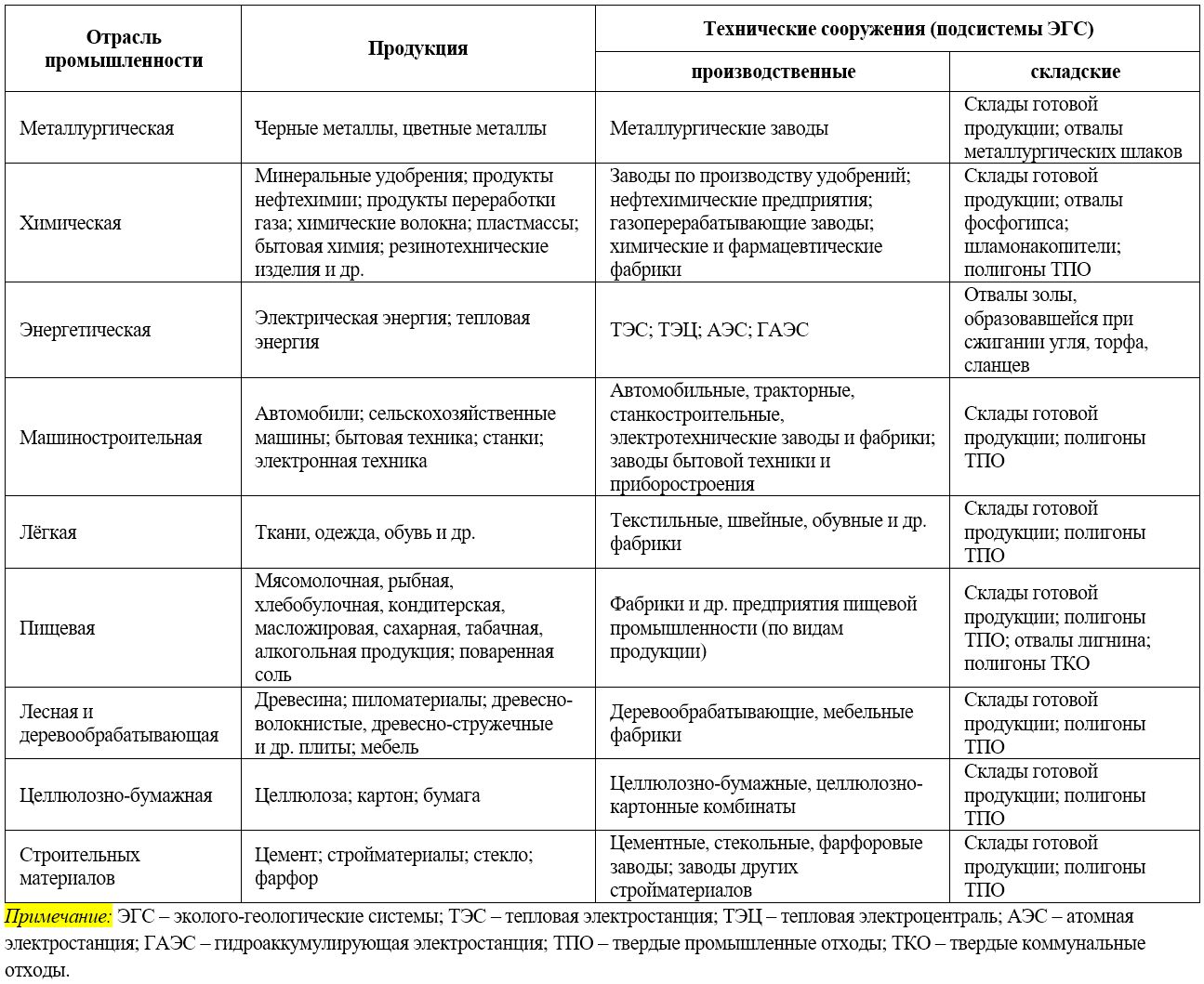 В промышленных ЭГС основную роль играют техногенные источники воздействий, специфика которых обусловлена типами этих воздействий, которые, в свою очередь, связаны с теми или иными инженерно-хозяйственными объектами отраслей промышленности (техническими подсистемами ЭГС).