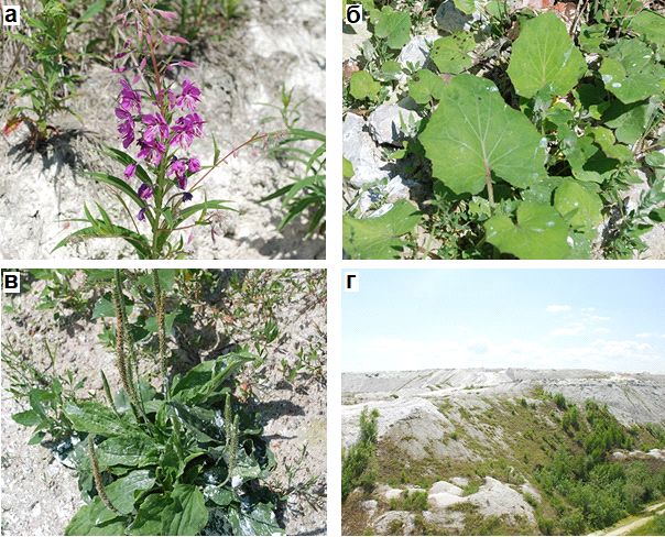 Рис. 9. Травянистые растения на отвалах фосфогипса и характер образования растительного покрова на них: а – иван-чай (Chamerion angustifolium); б – мать-и-мачеха (Tussilag farfara); в – подорожник большой (Plantago major); г – обрастание травянистыми и древесно-кустарниковыми растениями нижних и средних участков вогнутой поверхности склона отвала [37]