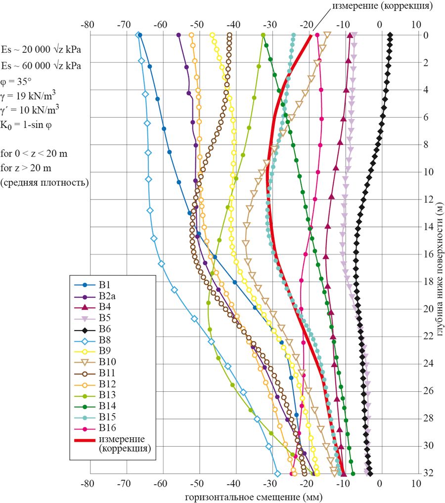 Рис. 5. Тестовая задача расчета ограждения берлинского котлована (Schweiger H.F. [5]): а – расчетная схема; Рис. 5. Тестовая задача расчета ограждения берлинского котлована (Schweiger H.F. [5]): б – исходные данные и результаты расчета: красной линией выделен результат натурных измерений