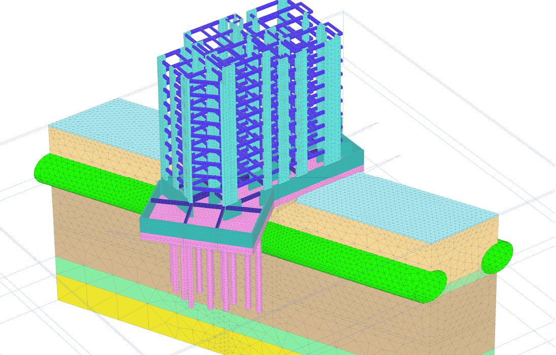 В связи со строгими требованиями оператора метро по минимизации воздействий на тоннели компания SAIDEL Engineering первоначально выполнила двумерный геотехнический анализ в программном комплексе PLAXIS 2D, чтобы определить осуществимые решения для строительства котлована и фундамента, которые соответствовали бы требованиям к смещениям грунта и прочности конструкций.