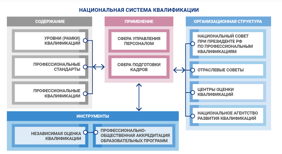Структура НСК выглядит так: Национальный совет по профессиональным квалификациям, отраслевые советы, центры оценки квалификации, Национальное агентство развития квалификаций.