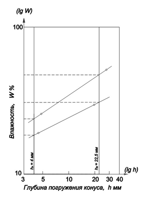 Консистенция грунта при погружении конуса на 22,5 мм соответствует влажности верхнего предела пластичности, а на 4 мм – влажности нижнего предела пластичности. Одну пенетрацию следует проводить при влажности грунта, соответствующей погружению конуса от 3 до 6 мм, а вторую от 18 до 25 мм, т.к. зависимость между глубиной погружения конуса и влажностью грунта, построенная в логарифмическом масштабе, близка к линейной.