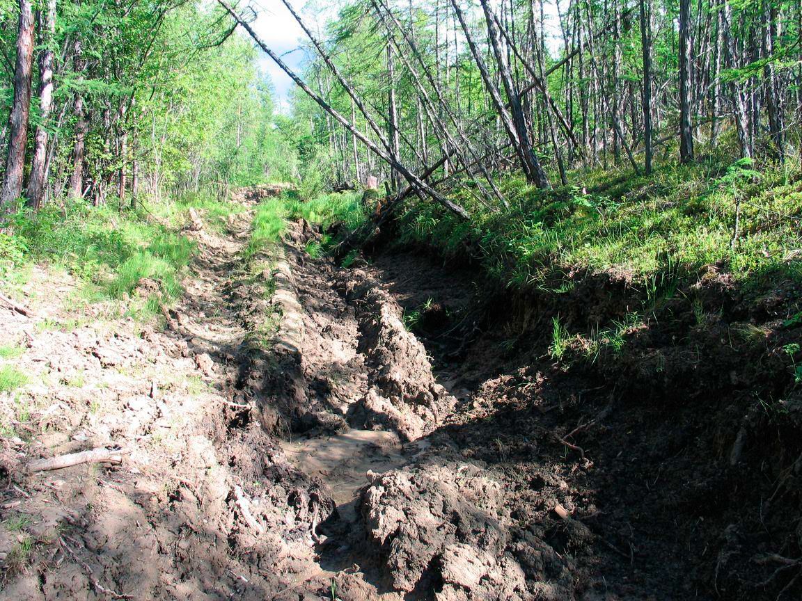 Рис. 4. Термоэрозионные последствия бессистемного движения гусеничной техники на участке трассы ж/д Томмот-Кердём. 2006 г. (фото Л.Г. Нерадовского).