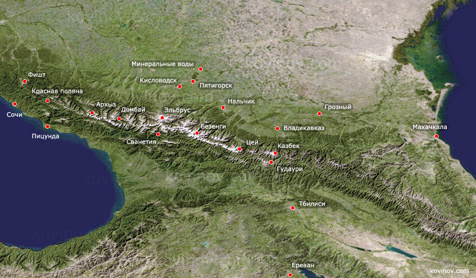 Рис. 1. Расположение Пятигорска, вулканов Эльбрус и Казбек на космическом снимке территории Кавказа [16]