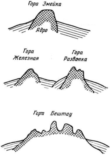 Рис. 5. Некоторые морфологические разновидности гор-диапиров в районе Пятигорска [18]