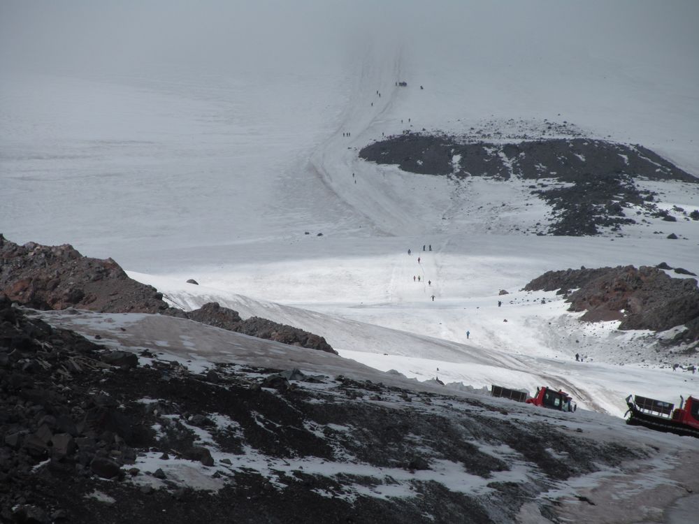 Рис. 7. Обычные туристы, приехавшие на верхнюю станцию канатной дороги, поднимаются на снежный конус Эльбруса по пути, проложенном ратраками, на высоте около 4 км над уровнем моря (фото автора)