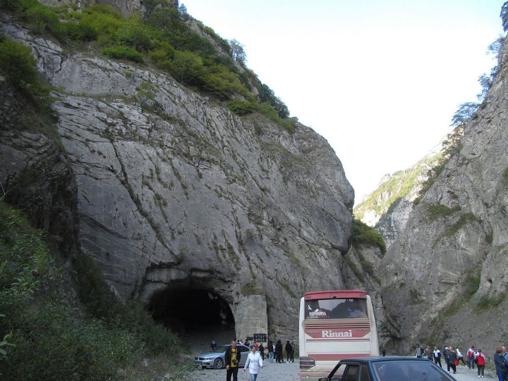 Рис. 21. Этот автомобильный тоннель и вся теснина вплоть до линии растительности были заполнены сошедшим ледником Колка в сентябре 2002 года. При этом надо учесть, что шоссе проходит намного выше русла реки Геналдон (фото автора, сентябрь 2020 г.)