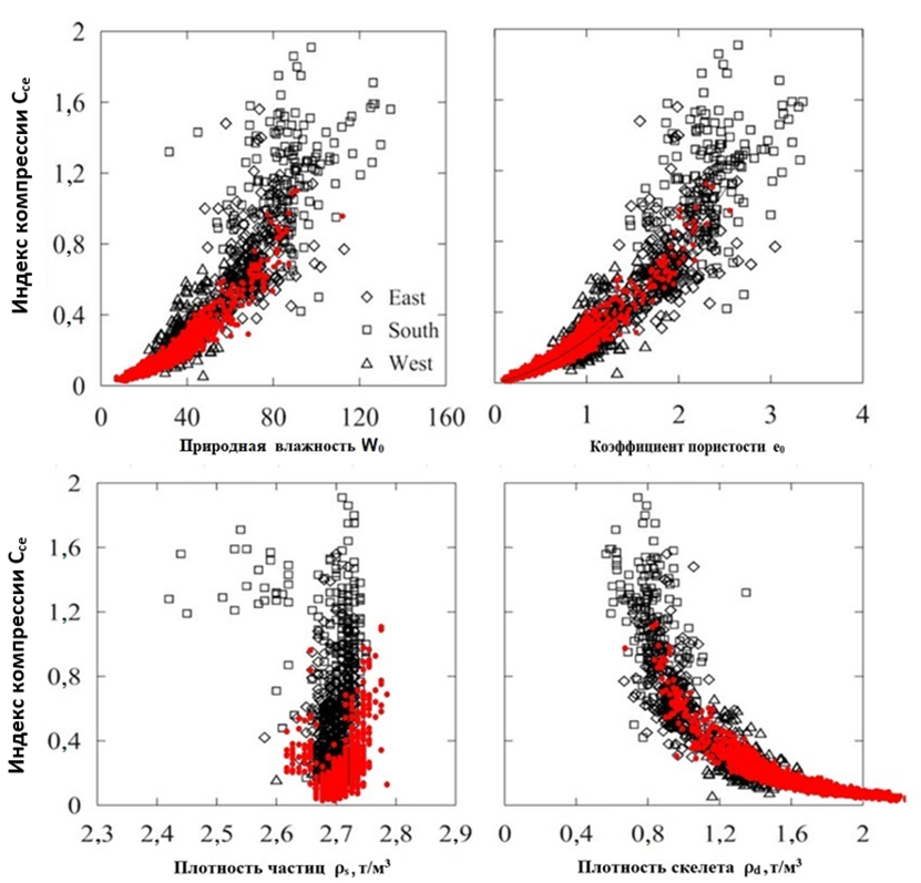 Рис. 2. Сравнение изменения индекса компрессии в зависимости от (слева-направо): влажности, коэффициента пористости, плотности частиц скелета, плотности сухого грунта для морских отложений, слагающих южное, восточное, западное побережья Южной Кореи 1200 испытаний [3, 8, 9] и Санкт-Петербурга (2850 испытаний — настоящее исследование)