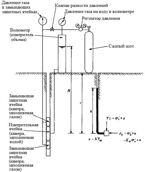 Когда зонд опускался в иcпытательный карман скважины до нужного уровня, воде позволяли вытекать из волюметра для накачивания измерительной ячейки в зонде вплоть до соприкосновения центральной части зонда со стенками прессиометрического кармана.