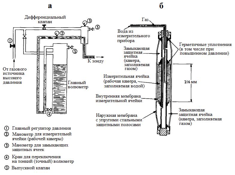 Рис. 5. Детали устройства волюметра и прессиометрического зонда: а – волюметр, схема передачи и измерения давления; б – частично расширенный зонд (тип G-B) [2]
