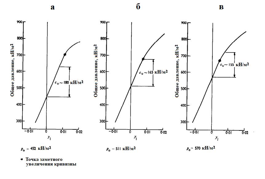 Авторы работы [2] отмечают, что значения недренированной прочности на сдвиг, определенные на основе идеально-упругопластического анализа результатов штамповых и прессиометрических испытаний, представляют собой некую форму эквивалентной прочности по данным измерений в некотором диапазоне деформаций. По их мнению, эти значения лучше всего подходят для использования при проектировании фундаментов и нагрузок свай на основания.