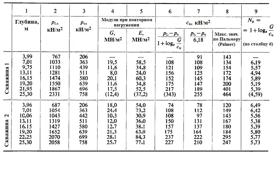 Итак, Марслэнд и Рэндольф [2] сопоставили оценки недренированной прочности на сдвиг и модулей деформации полутвердой трещиноватой лондонской глины, полученные на основе прессиометрических испытаний с использованием зонда диаметром 60 мм и на основе испытаний штампом диаметром 865 мм на глубинах до 24 м. Испытания штампом деформируют объем грунта, который содержит достаточное количество трещин и других ослабленных плоскостей для полномасштабных испытаний. Авторы работы [2] подчеркивают, что оценки величин недренированной прочности на сдвиг и модулей сдвига по результатам этих тестов особенно хорошо подходят для проектирования фундаментов. Эти значения они использовали в качестве основы для оценки прессиометра как инструмента, необходимого для проектных работ.