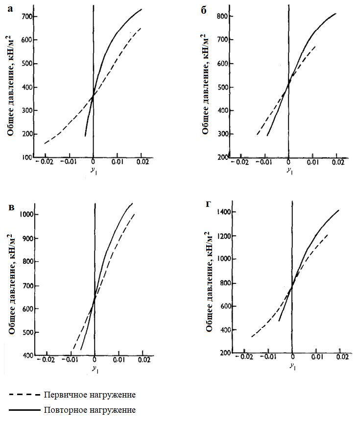 Полевые испытания нагружением плоских штампов диаметром 865 мм Марслэнд и Рэндольф [2] проводили в скважинах диаметром 900 мм на глубинах 6,1; 12,2; 18,3 и 24,4 м от поверхности земли.
