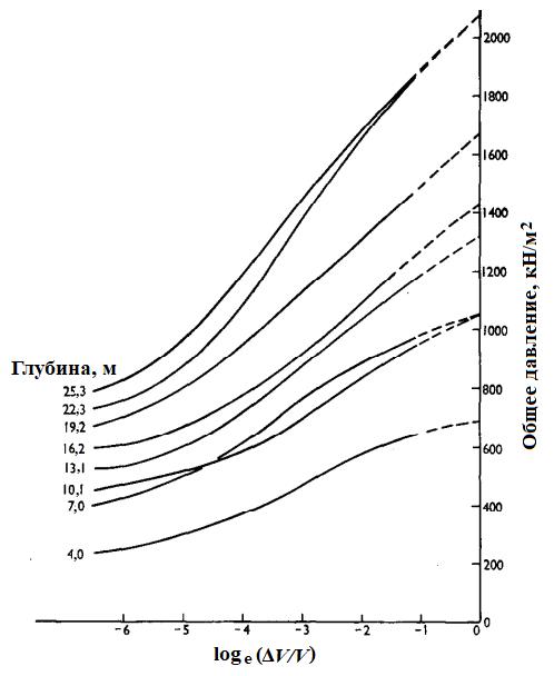 2. Общее давление, действующее на стенку испытательного кармана скважины, представляет собой давление, определяемое первым пунктом, которое при испытаниях было меньше, чем давление, требуемое для растяжения резиновых мембран и металлической защитной оболочки. Калибровочные испытания проводились путем расширения зонда в неограниченном состоянии и построения графика изменений объема в зависимости от давления. Одним из результатов этой коррекции было следующее: даже притом что к волюметру были приложены равные приращения давления газа, приращения давления, действовавшие на грунт, уменьшались с увеличением приложенного давления. Ближе к концу испытания коррекция значительно увеличивалась, и только приблизительно 10–20% от приложенного давления газа было передано на испытываемую глину.