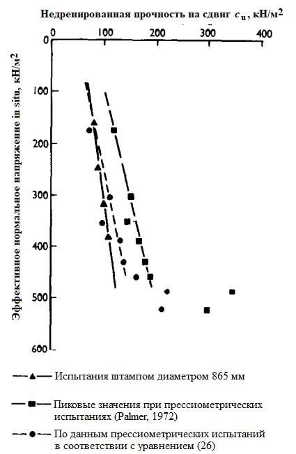 Авторы работы [2] предполагают, что, поскольку лондонская глина сильно переуплотнена, причем с более высокими горизонтальными напряжениями по сравнению с вертикальными, ее прочностные свойства будут демонстрировать некоторую степень анизотропии. Ссылаясь на данные Бишопа (Bishop, 1966), Марслэнд и Рэндольф [2] пишут, что, как показало большое количество трехосных испытаний лондонской глины, анизотропия ее структуры и напряжений in situ оказывает заметное влияние на прочность, определенную по результатам измерений. Поскольку в исследованном Марслэндом и Рэндольфом случае [2] горизонтальные напряжения были больше вертикальных, простой интуитивный подход, основанный на проскальзывании друг относительно друга фрикционных блоков, приведет, по их мнению, к более высоким значениям прочности по данным прессиометрических испытаний, чем по результатам штамповых тестов. Этот эффект проиллюстрирован на рисунке 13, где показаны зависимости недренированной прочности на сдвиг от соответствующих эффективных нормальных напряжений in situ.