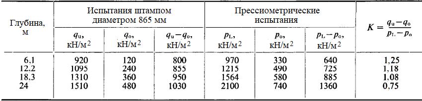Марслэнд и Рэндольф [2] отмечают, что значение K=l,5 в формуле (28) ниже, чем величина K=1,8, предложенная Менардом для основания буронабивной сваи в связном грунте, даже несмотря на то что эмпирическое значение Nc=9,25, полученное при испытаниях крупным штампом, было основано на максимальных давлениях на основание, которые имели место при осадках, эквивалентных примерно 15% от диаметра штампа. А значения K, определенные по соотношениям (qu–qо)/(pL–pо), найденным на основе штамповых и прессиометрических испытаний, еще ниже. Они уменьшаются с 1,25 на глубине 6,1 м до 0,75 на глубине 24,4 м. Эти результаты Марслэнд и Рэндольф [2] свели в таблицу 2, которая подчеркивает необходимость осторожности при определении соотношений результатов для двух разных видов потери устойчивости с помощью эмпирического коэффициента. Этот коэффициент, вероятно, будет значительно варьировать для разных типов грунта, а для такого материала, как лондонская глина, он также будет зависеть от анизотропии грунта и размера зонда прессиометра относительно структуры глины.