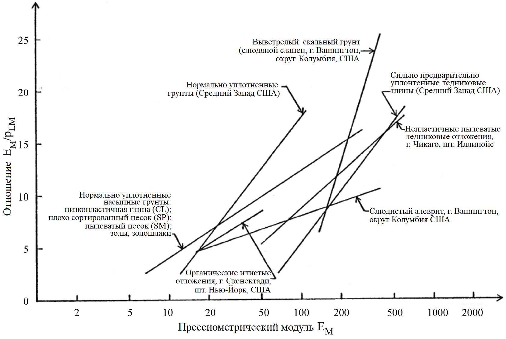 В одной из вышеуказанных статей (Kastman, 1978) соотношение между модулем Менара и результирующим (net) предельным давлением EM/pLM используется в качестве индикатора качества испытания (или нарушений) и для идентификации грунта. На рисунке 9 показаны результаты этой работы, полученные для различных грунтов с помощью испытаний прессиометром в США и с применением отношения EM/pLM как функции логарифма прессиометрического модуля. На этом рисунке ясно видна сильная линейная зависимость для каждого типа грунта. Было обнаружено, что отношение EM/pLM находится в диапазоне от 8 до 12 для нормально консолидированных грунтов и от 12 до 20 для переуплотненных (Kastman, 1978).