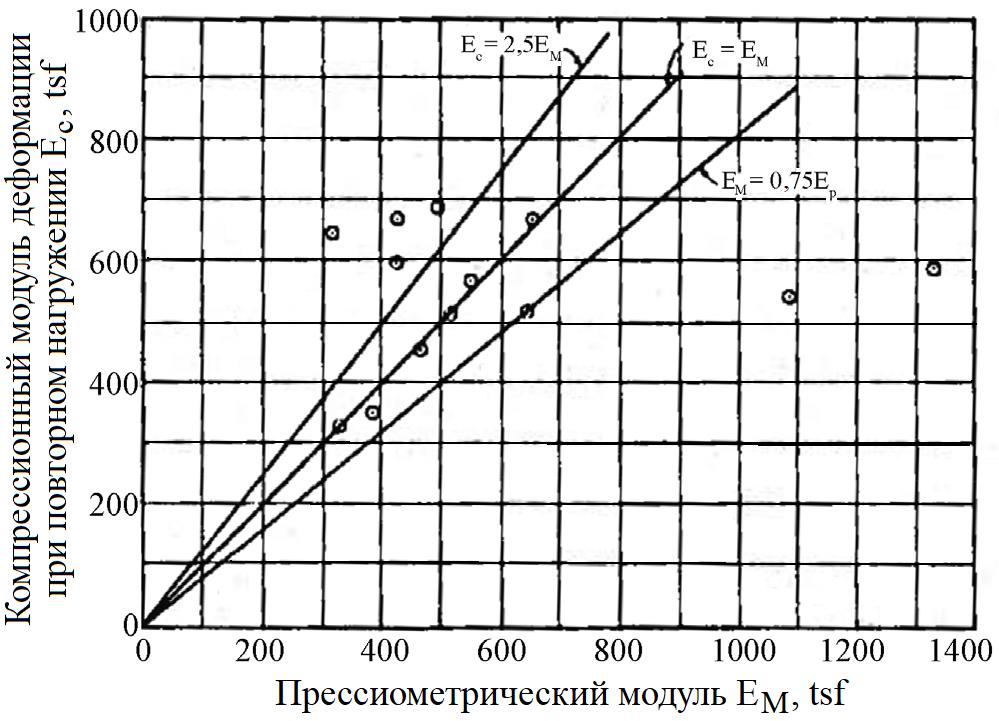 Рис. 10. Ваимосвязь между компрессионным модулем деформации, определенным при повторном нагружении во время компрессионных испытаний (Ec), и прессиометрическим модулем (EM). Примечание: tsf – тонн на квадратный фут (ton per square foot); 1 tsf = 95,76 кПа