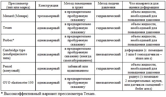 Таблица 7. Наиболее распространенные прессиометры, упоминаемые в североамериканских публикациях и документах