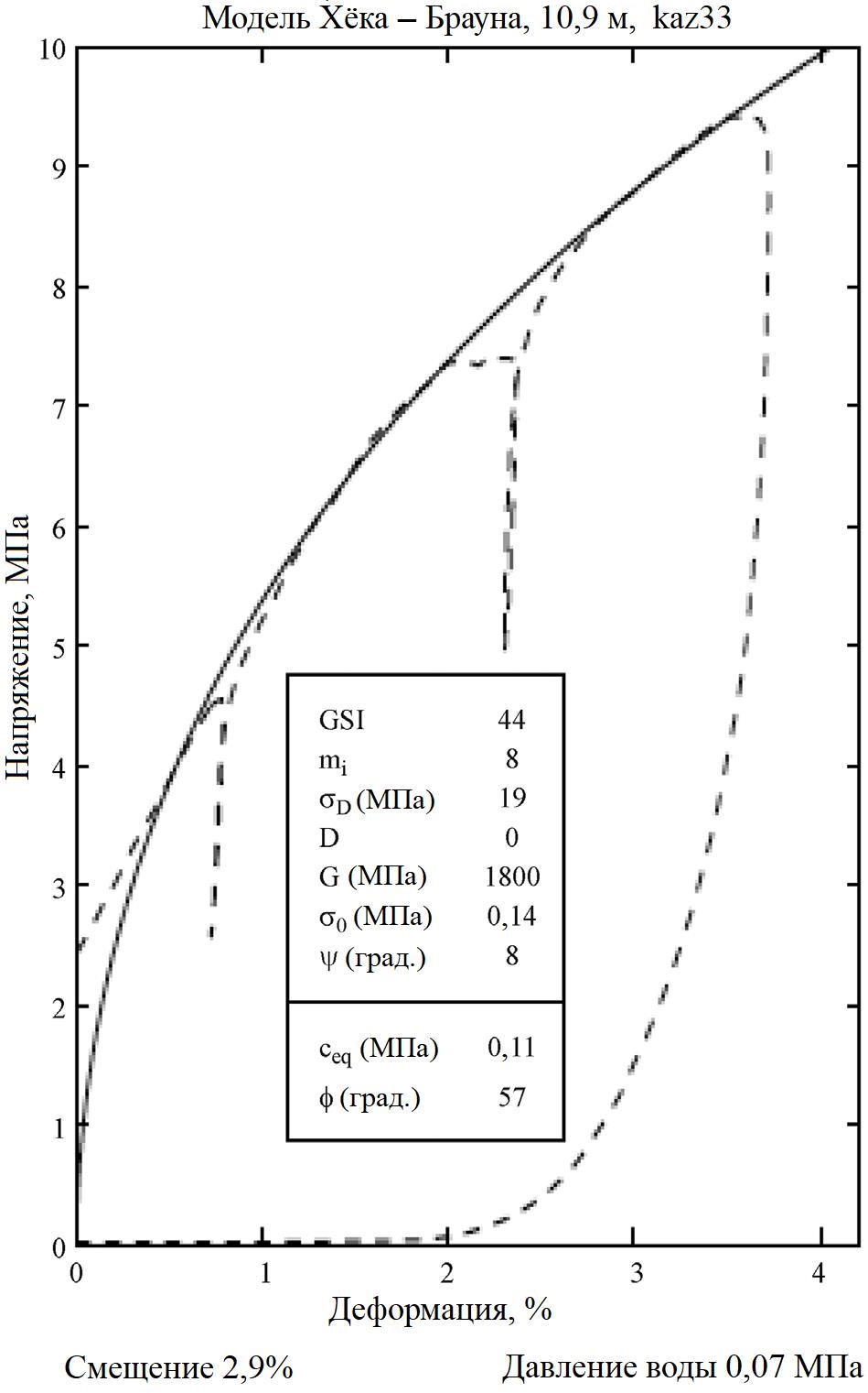 Рис. 12. Кривые прессиометрических испытаний в слабом скальном грунте на основе реальных измерений и на основе модели Хёка – Брауна (по Dafni, 2013; Yang, Zou, 2011) (GSI – Geological Strength Index – геологический индекс прочности Хёка – Брауна)