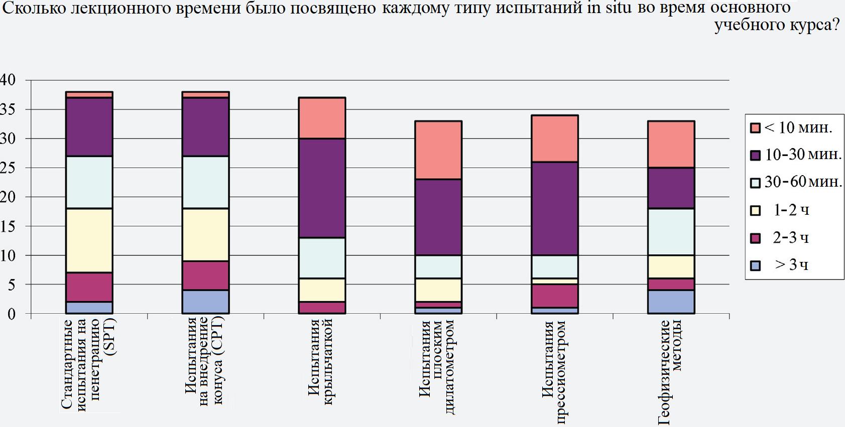 Рис. 14. Количество лекционного времени, потраченного на разные типы геотехнических испытаний in situ во время основных учебных курсов в вузах США, имеющих отношение к геотехнике, на основе 40 анкет (Benoit, 2013)
