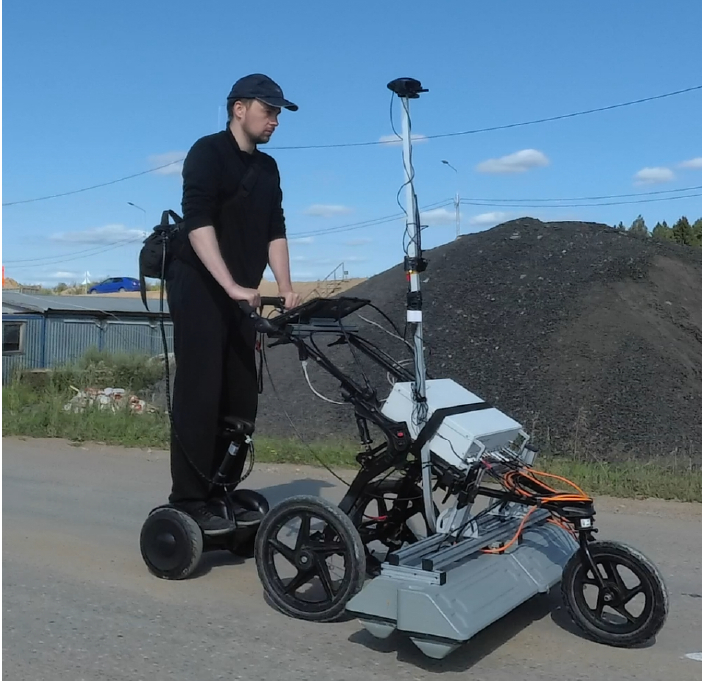 Перемещение аппаратуры в процессе сканирование осуществлялось на скорости до 15 км/ч с использованием гироскутера. Время сканирования профиля в одну сторону заняло около 5 минут, при этом в процессе измерения одного профиля было собрано 15 радарограмм с ~25400 трасс в каждой.