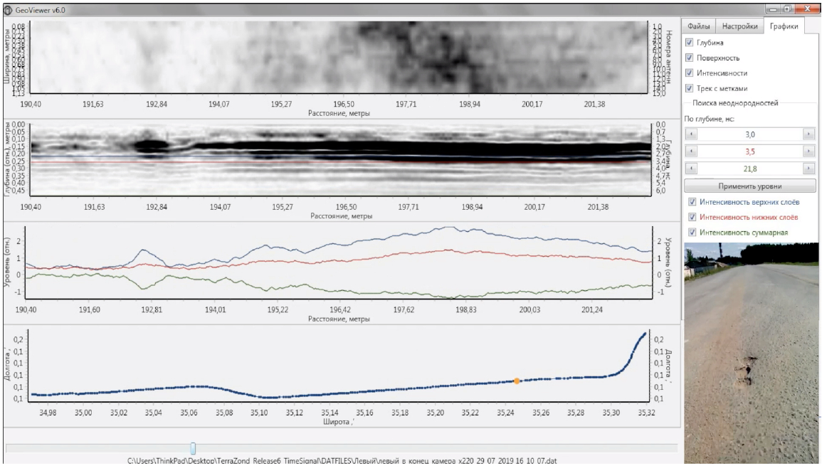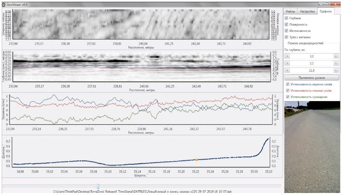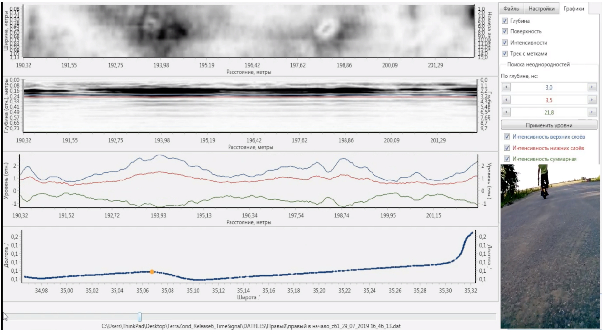 Рис. 3. Вариант первичной визуализации результата, как смещение во времени окна выборки с данными дорожной карты, изменения интенсивности слоев, GPS позиции, синхронизированное с видеозаписью окружающего пространства