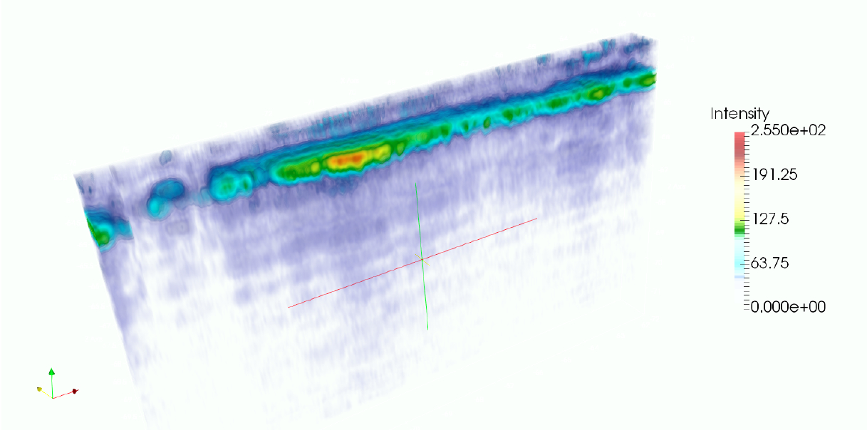 Рис. 5. Результат обработки ~15-ти метрового отрезка с применением алгоритма радиоволнового томосинтеза