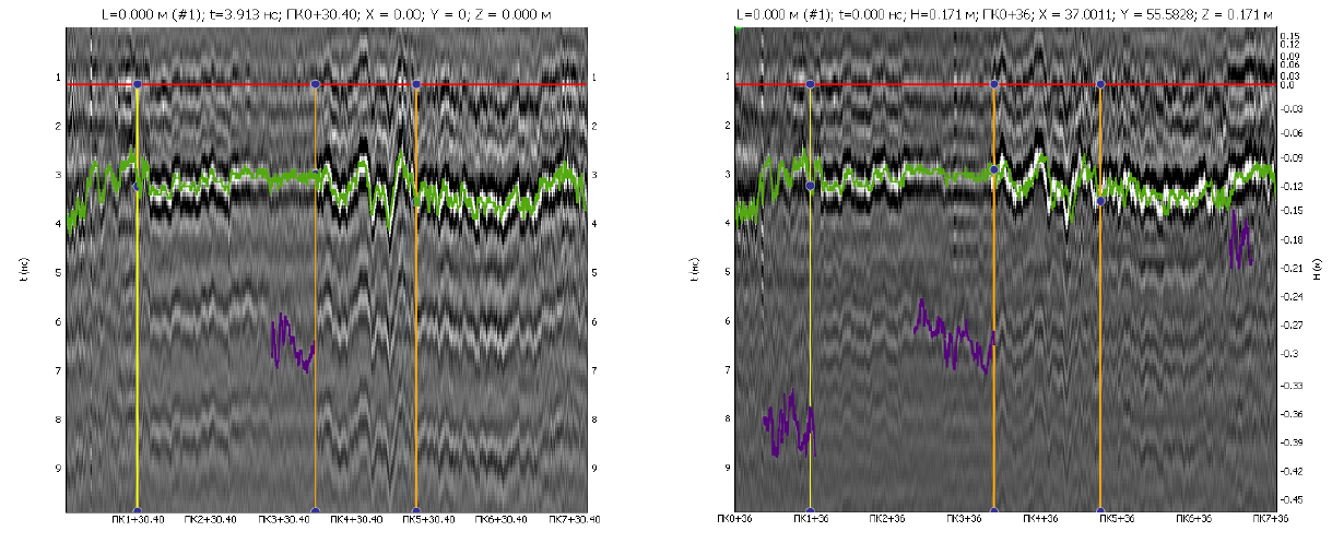 Рис. 8. Результат интерпретации радарограммы правого профиля с применением автоматизированного алгоритма поиска границы – (слева) угол размещения плоскости антенной решетки к поверхности 15 градусов, прямое направление движения; (справа) антенная решетка размещена параллельно поверхности дороги, обратное направление