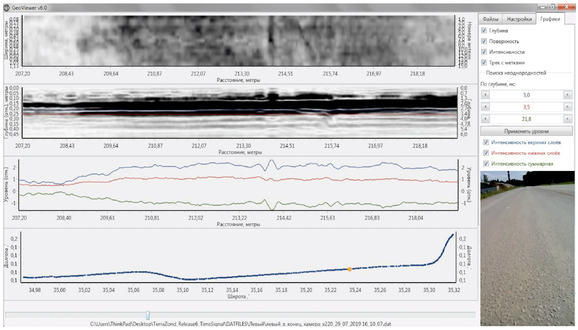 Обработка радарограмм производилась в программном обеспечении GeoReader (ООО «ТИМ») с ассоциацией контрольных выработок для дальнейшего уточнения количественной информации по конструктивному слою (скорости, диэлектрической проницаемости и толщины).
