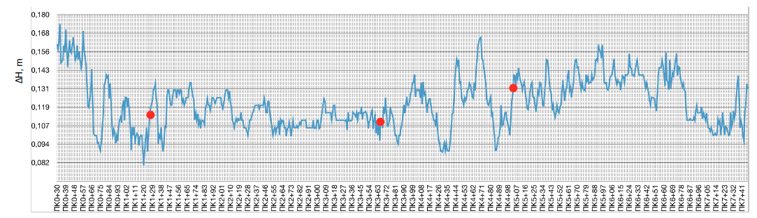 Для выявления ослаблений в процессе анализа данных использовались результаты расчета по толщинам асфальтобетонного покрытия с шагом 0,5 м. Для полученных значений толщин рассчитывалось среднее, а также определились максимальные и минимальные значения. Среднее значение толщины асфальтобетона – 12 см, минимальная толщина – 9 см, максимальная – 16 см. В качестве основного критерия определения участков ослабления дорожной конструкции рассматривалось наличие резких утолщений (просадок) верхнего слоя. Таким образом были выделены участки со значением толщины выше 2 см. Далее были построены планы и трехмерные модели (.dxf) с выделением потенциально ослабленных участков различными цветами – желтый цвет соответствует толщине 13 см, оранжевый – 14 см, красный – выше 15 см).
