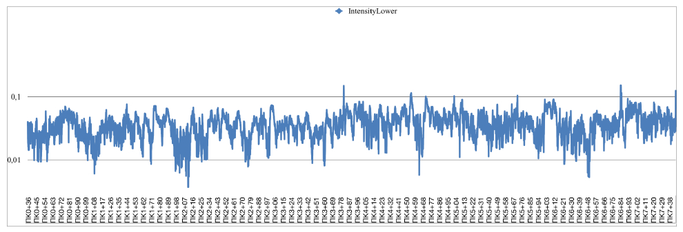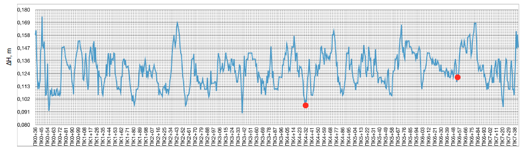 Исследование дорожного полотна проводились по двум профилям, в прямом и обратном направлении сканирования. Шаг опроса решетки был выбран равным 28 мм. Процесс измерений фиксировался на видеокамеру. Позиционирование аппаратуры производилось с помощью встроенного GPS приемника, а также развернутой системой RTK GNSS в кинематическом режиме.
