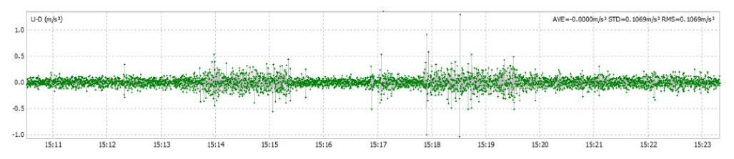 Для контроля тряски антенн в процессе сканирования проводилась запись параметров инерционной системы для обоих направлений движения. Средние значения мгновенных угловых ускорений относительно оси «вверх/вниз» (рис. 15) не превышают 0,2 м/c2, в единичных случаях ускорения достигают 0,5 м/c2 и выше.