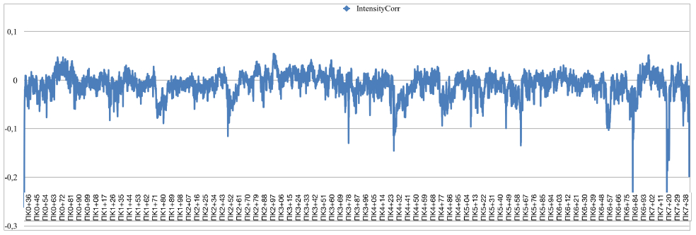 Результаты исследований многоракурсной георадиолокации представлены в итоговом отчете в виде дорожных карт, распределений интенсивности изменения верхних и нижних слоев, а также обработанных и необработанных радарограмм. Дорожные карты и зоны распределения интенсивности разбиты на отрезки по 15 м.