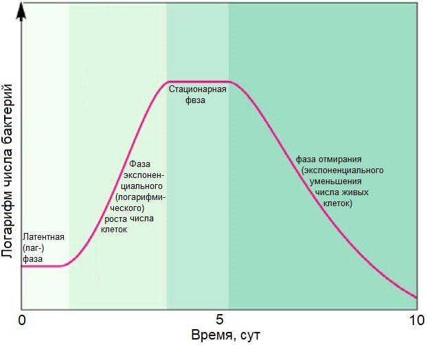 Фаза экспоненциального (логарифмического) роста характеризуется самой высокой скоростью размножения бактерий, когда каждая клетка в популяции делится на две наиболее часто. (Обычно в конце предыдущего этапа выделяют еще фазу замедления роста, когда увеличение количества клеток замедляется из-за постепенного исчерпания питательных веществ в среде и/или отравления микроорганизмов продуктами их же жизнедеятельности. – Ред.).