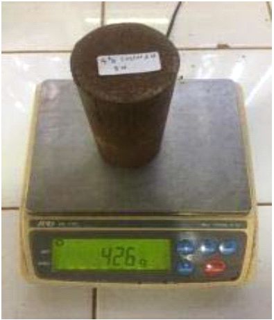С оставшейся частью грунта, доведенной до оптимальной влажности, выполнили следующие процедуры. Смешивали грунт с культурами бактерий возрастом (после посева) 2, 4 и 6 суток в количестве 4, 6 и 8% от массы грунта с оптимальной влажностью. Затем из этих смесей формовали образцы диаметром 5,5 см и высотой 11 см и выдерживали их в течение 3, 7, 14 и 28 дней для ожидаемого увеличения прочности грунта с помощью жизнедеятельности бактерий Bacillus subtilis. Поверхность образцов с бактериями после выдерживания в течение нескольких дней выглядела беловатой (рис. 4). Затем образцы измеряли, взвешивали (рис. 5) и проводили с ними испытания на прочность при одноосном сжатии (рис. 6).