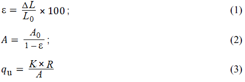 Испытания на одноосное сжатие выполняли для получения значений относительной осевой деформации ε, конечной средней площади поперечного сечения A и на этой основе – предела прочности образца при сжатии qu: