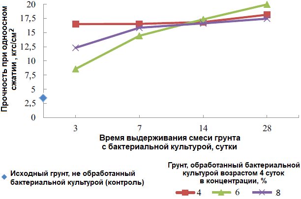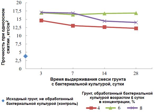В исследовании, представленном в настоящей статье, в отличие от предыдущих работ использовали разное количество вводившейся в грунт бактериальной культуры (4, 6, 8% от массы грунта с оптимальной влажностью), разный возраст этой культуры с момента посева в жидкую питательную среду (2, 4, 6 суток) и разное время выдержки смеси грунта с бактериями (3, 7, 14, 28 суток) в поисках оптимальных условий для получения наилучшей  прочности на одноосное сжатие.