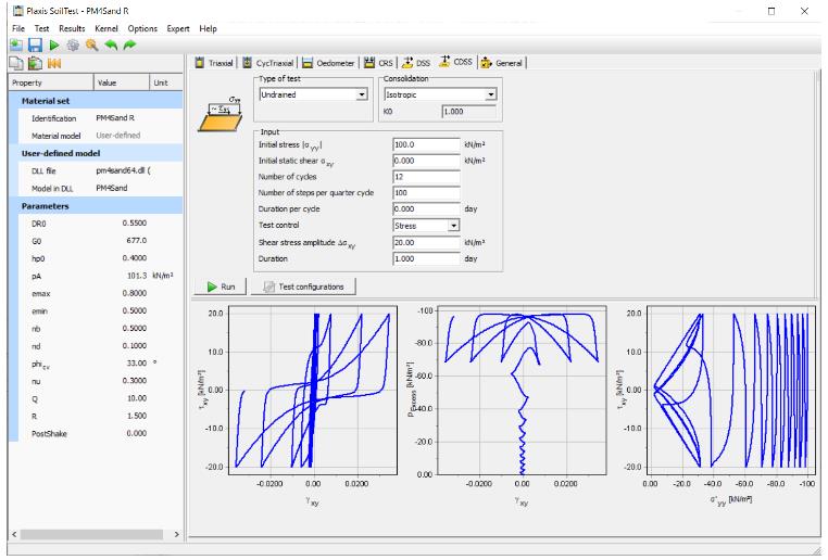 Рис. Моделирование недренированного циклического испытания на прямой простой сдвиг (DSS) для модели PM4Sand с помощью подпрограммы SoilTest (виртуальной лаборатории), встроенной в PLAXIS