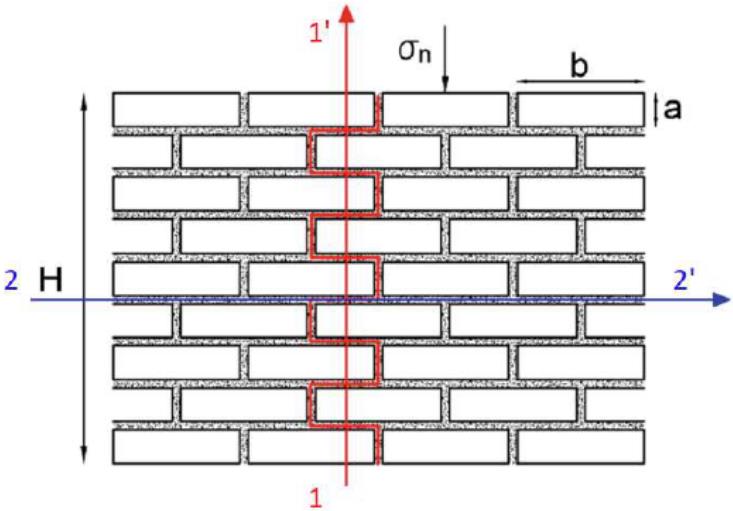В программном комплексе PLAXIS имеется пользовательская модель для имитации поведения сооружений из каменной или кирпичной кладки (Masonry model). Она была разработана в сотрудничестве с Римским университетом Ла Сапиенца [6, 14] и включает анизотропную прочность с заданными направлениями разрушения на основе типичного способа кладки и структуры кирпичей или каменных блоков. Модель Masonry основана на модели для скальных пород (Jointed Rock model  см. [10]). На рисунке показаны характерные механизмы разрушения вдоль вертикальных (1-1′) и горизонтальных (2-2′) швов, которые учитываются в модели. Параметры прочности на сдвиг по Кулону и прочности на растяжение в различных направлениях разрушения зависят от механических свойств кирпича или камня и цементирующего раствора, а также от геометрических параметров строительного блока a и b.
