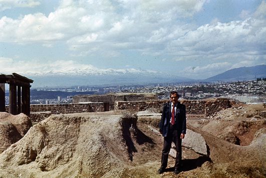 16 мая. Около 5 утра излишне быстро застучало сердце и разбудило меня. С валидолом удалось уснуть, проспал почти до восьми, встал с шумом в ушах, видимо, что-то с давлением. Поэтому решил дать себе отдых: поехал вместе с А.И. Хохловым в Маргавит на северо-востоке республики за Кироваканом к волгоградской буровой бригаде. Ехали по загруженной дороге, заехали на площадку размещения школы, посмотрели разрез, затем поехали в тоннельный отряд, приняли душ, от чего ощутили почти восторг. По дороге назад возле деревни Ширакамут заехали в пещерный «город», который раньше видели с шоссе, но не было времени остановиться. Посмотрели пещеры в туфе, ходили по подземным переходам. Похоже, этому поселению несколько тысяч лет. Зато в 1989 году масляной краской современные варвары оставили на стенах следы своей «культуры». Затем заехали в Гегасар: Хохлов ещё не видел линию вспаривания. Машину оставили в деревне, поднялись на склон метров на 400, осмотрели и «разрыв», и панораму с разрушенными сёлами. Я следил внимательно за собой: смогу ли подниматься на гору? Вечером после планёрки состоялся 2-часовой разговор с Хачатряном Самвелом Октемберовичем старшим научным сотрудником института геофизики и сейсмологии АН АрмССР о принципах проектирования и строительства в сейсмических районах, о изучении трещиноватости с помощью биолокации, о роли трещиноватости оснований в устойчивости зданий. Он предложил соавторство в публикации материалов, очень заинтересовался результатами, особенно по гостинице Ширак и ряду других объектов, но я тогда ещё не готов был к этому, многое не «отстоялось» в голове, а выступать с сырыми мыслями не хотелось. Без 10 полночь ощущался толчок, похожий на землетрясение.