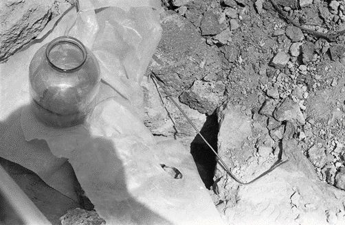 Рис. 1. Мой биолокационный «индикатор» (проволока с согнутым на ширину ладони одним концом). Для масштаба – трёхлитровая банка с водой остывает под струёй ледяного воздуха из щели у подножья западного склона Арагаца. Лето 1989 г.