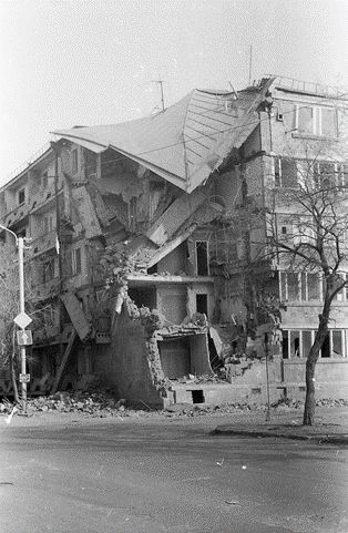 Рис. 3. Монолитная железобетонная школа (а). Стены выгнулись, но устояли (б). Никто не погиб